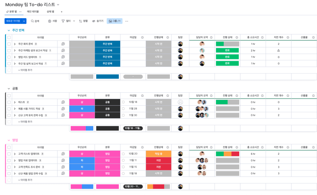 주간 반복 업무, 공통 업무, 부서별 업무(영업·마케팅·운영 등)를 그룹화하여 체계적으로 관리할 수 있도록 구성되어 있어 팀 전체의 업무 흐름을 한눈에 파악하는 데 유용합니다.