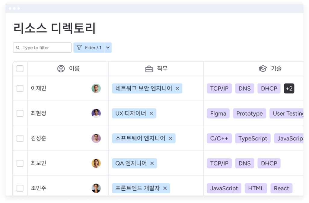 리소스 관리 템플릿과 함께 활용되는 리소스 디렉토리는 프로젝트에 투입 가능한 팀원의 정보를 정리한 데이터베이스 형태로 구성됩니다.