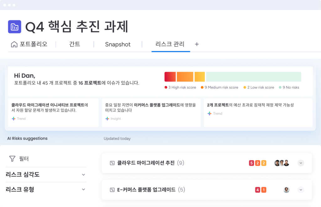 업무 공간에 입력된 데이터를 분석하여, 프로젝트 진행 과정에서 발생할 수 있는 잠재적 리스크를 사전에 감지하고 알려주는 AI 기능 ‘Risk Insight’를 제공합니다. 문제가 커지기 전에 미리 신호를 보내, 보다 안정적인 프로젝트 운영을 지원합니다.