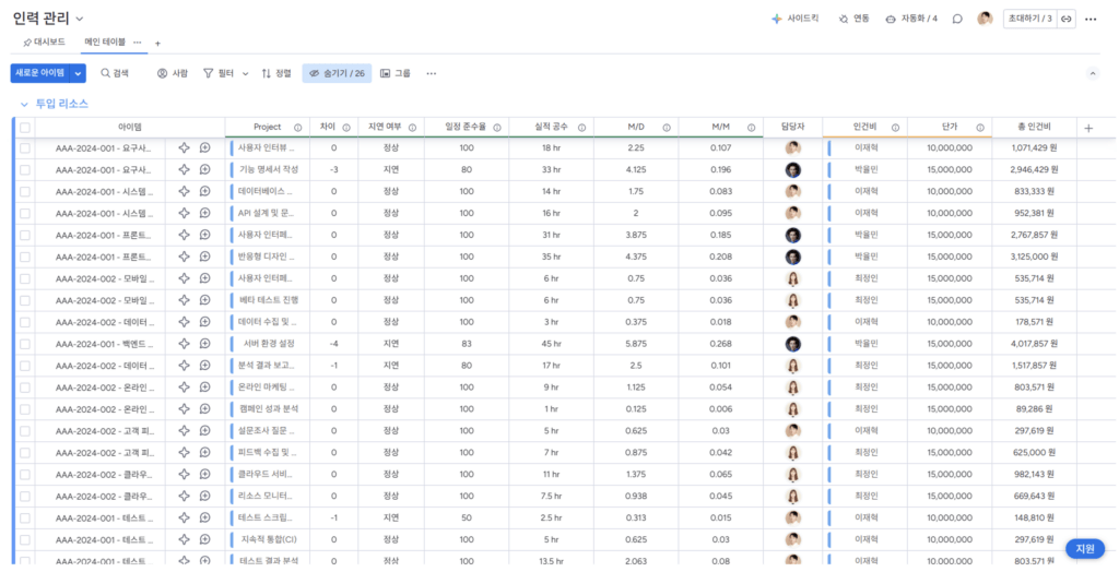 각 팀원이 어떤 프로젝트에 얼마만큼 투입되어 있는지를 자동으로 취합·계산해 보여주기 때문에, 특정 인력에게 업무가 집중되거나 반대로 여유 인력이 제대로 활용되지 않는 문제를 효과적으로 예방할 수 있습니다