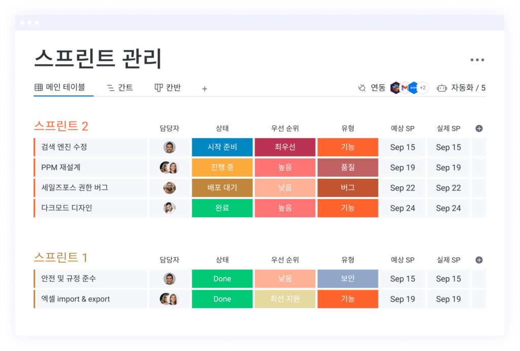 입력된 데이터를 기반으로 업무 상태별, 업무 유형별, 우선 순위별 등 원하는 기준으로 필터링하여 칸반 형태로 시각화 할 수 있습니다. 이를 통해 스프린트 내에서 어떤 업무가 어느 단계에 위치해 있는지 한눈에 파악할 수 있으며, 팀 전체의 속도, 병목 지점, 진행 중 이슈 등을 빠르게 확인하는 데에 매우 유용합니다.