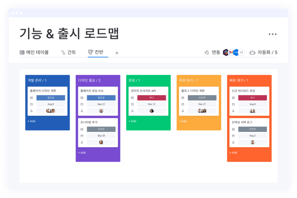 개발팀의 실제 업무 프로세스에 맞추어 프로젝트를 설계 → 디자인 → 개발 → 테스트 → 이행의 5단계로 세분화한 커스텀 템플릿입니다. 각 단계는 완료 / 진행 중 / 지연 / 이슈 상태로 구분해 표시되며, 이를 통해 단계별 정확한 진행 현황을 보다 세부적으로 파악할 수 있습니다.