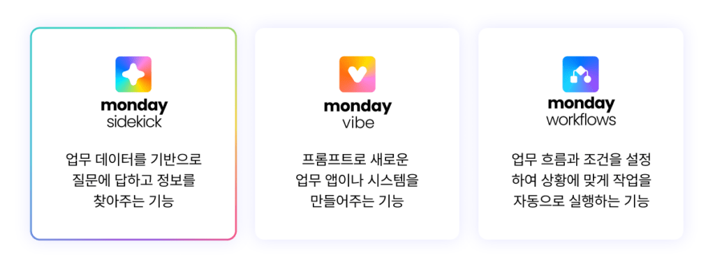 monday Sidekick, monday vibe, AI Workflows와 같이 다양한 AI 기능들이 개별 도구에 머무르지 않고, 하나의 통합된 업무 환경을 만들어가는 방향으로 설계되고 있습니다.