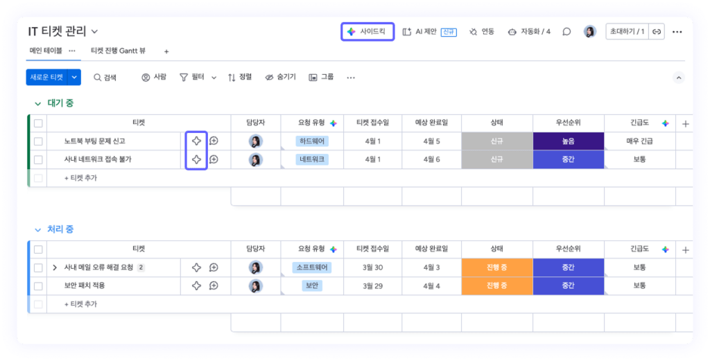 - 실행 방법: 보드 상단 – [사이드킥] 클릭 or 아이템명 옆 별 아이콘 클릭