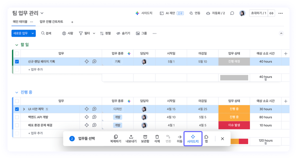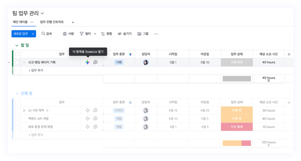 Sidekick에 “지연된 태스크만 모아서 보여줘”, “이번 주 마감인 태스크를 알려줘”와 같이 요청하면, 보드 데이터를 분석하여 핵심 정리된 결과를 제공합니다.