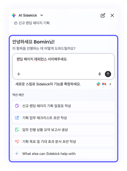 Sidekick을 실행하면 미니 홈 화면으로 이동하며, 조직 내 보드, 문서, 팀 활동 등 업무 전반의 맥락을 이해한 상태에서 즉각적인 도움을 받을 수 있습니다. 단순한 검색을 넘어, 현재 업무 상황에 맞는 정보를 제공하는 것이 특징입니다.