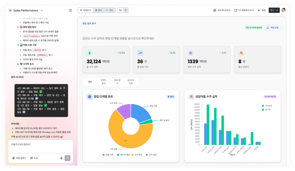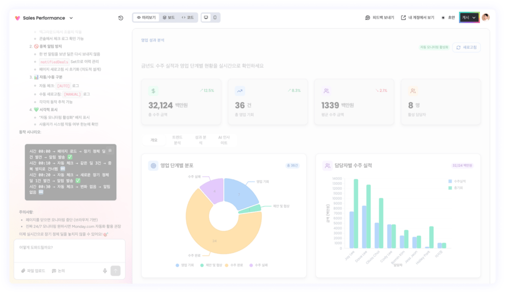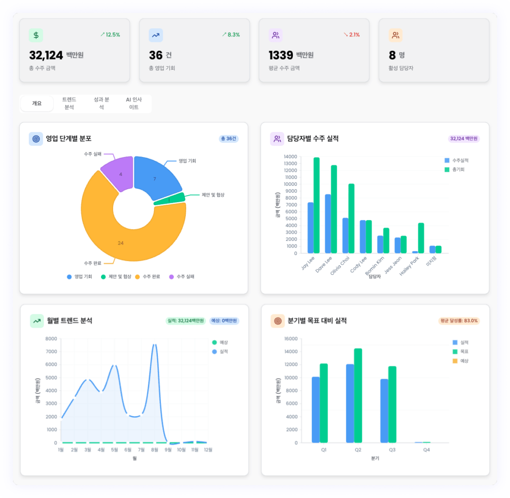 - 프롬프트: 영업 기회 관리 보드에서 금년도 수주 금액이 어떤지, 각 영업 단계별로 딜이 어떻게 분포가 되어있는지, 담당자별로 수주 금액이 어떻게 되는지 알고 싶어요