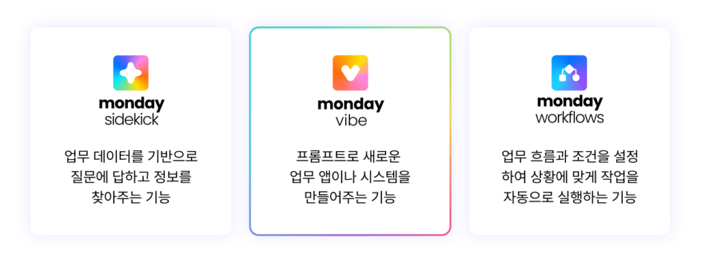 특히, monday vibe는 단순히 지시를 수행하는 데 그치지 않습니다. 사용자의 목적과 맥락을 이해하고, 필요한 기능을 능동적으로 제안하며, 더 나은 업무 흐름을 설계하도록 돕습니다.