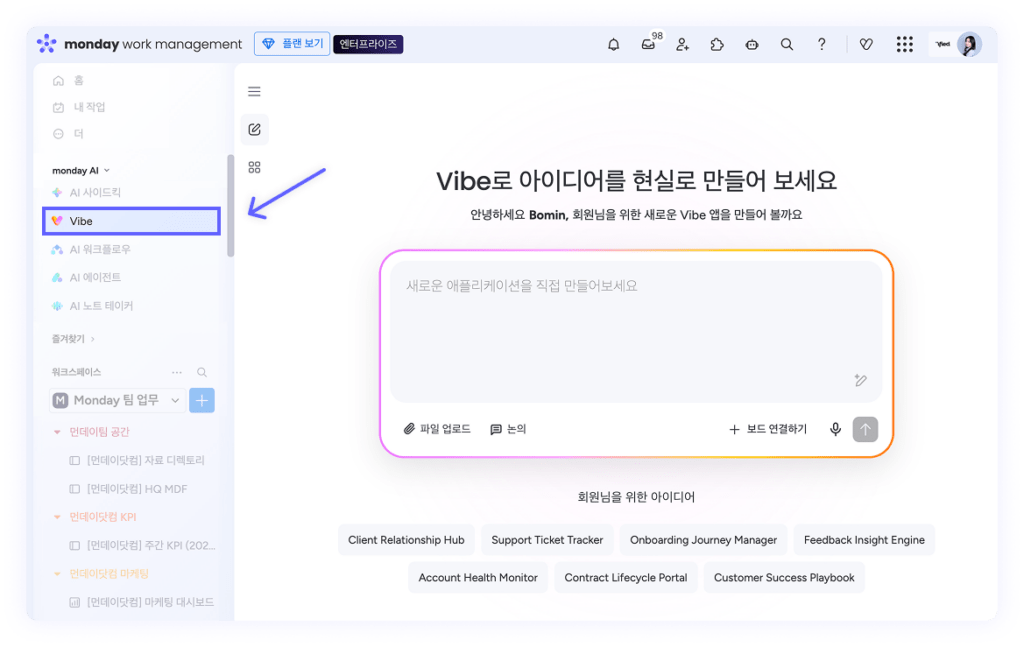- 패널에서 시작하기: 좌측 monday AI 패널 – [monday vibe] 클릭