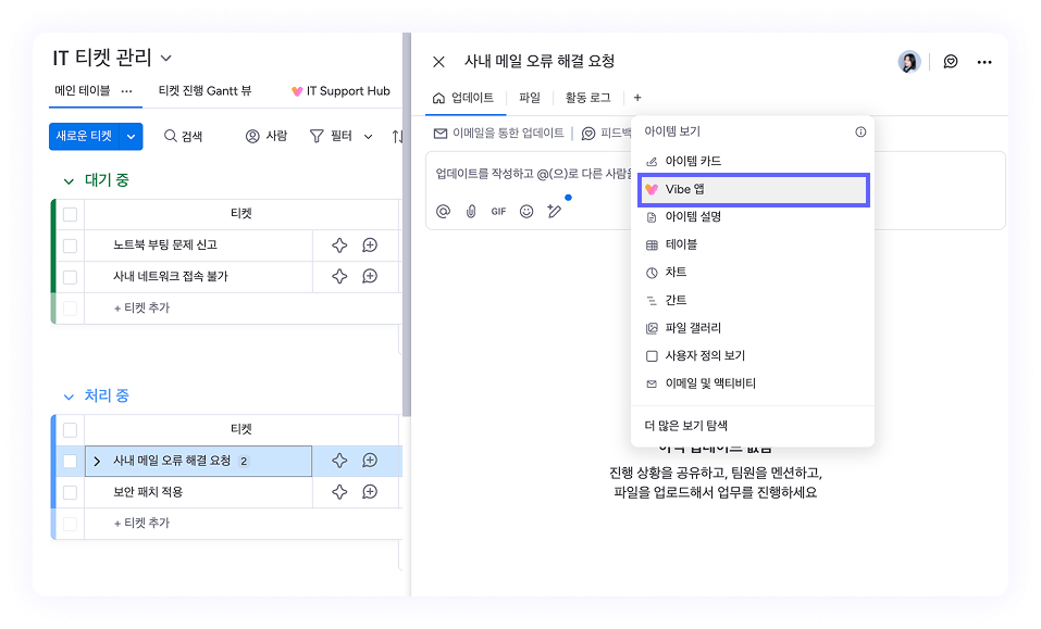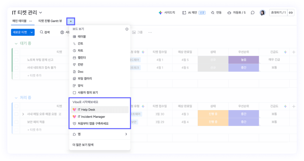 앱을 생성하고 싶은 보드에서 ‘뷰(보기) 추가’ 버튼을 통해 간편하게 추가할 수 있습니다. 또한, 이 영역에서는 해당 보드에 적합한 추천 Vibe 앱 아이디어도 함께 확인할 수 있어, 처음 사용하는 경우에도 쉽게 시작할 수 있습니다.