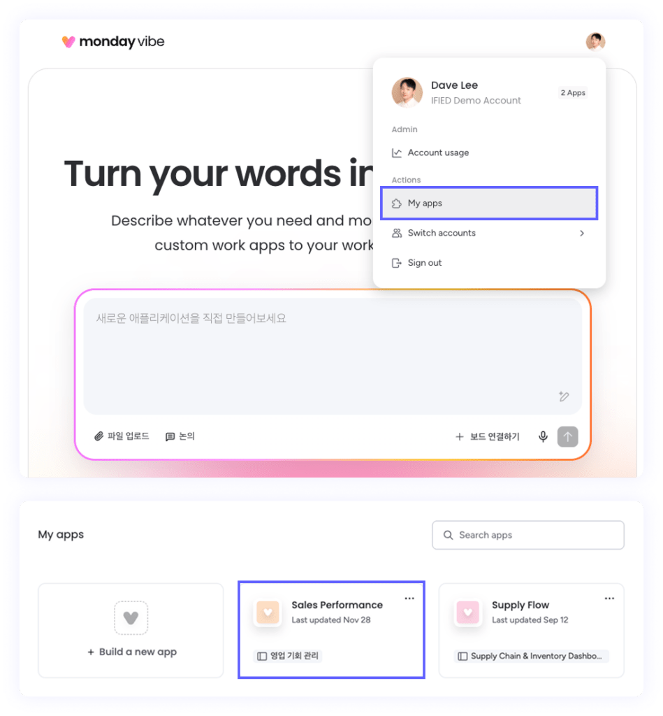 생성한 앱은 monday vibe 홈페이지 ‘My apps’ 메뉴에서 확인하고 관리할 수 있습니다.