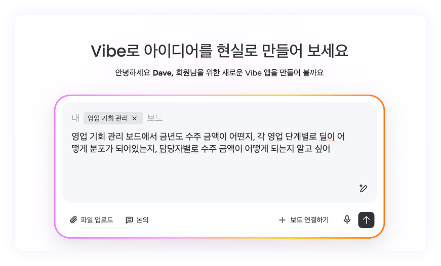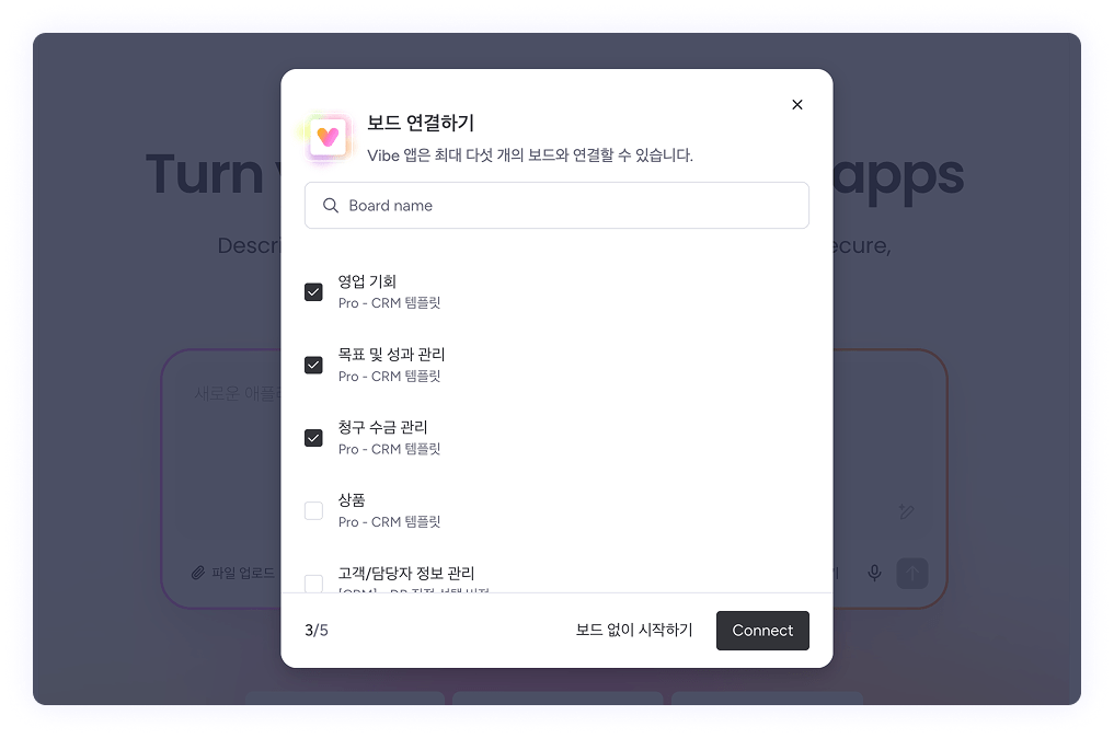 ⚠️ 참고사항: 좌측 패널을 통해 Vibe 페이지에서 바로 시작하는 경우(보드 내부가 아닌 경우), [보드 연결하기] 버튼을 통해 관련된 보드를 연결할 수 있습니다. 기존 데이터를 기반으로 할수록, 더 정확하고 유용한 앱 생성이 가능합니다.