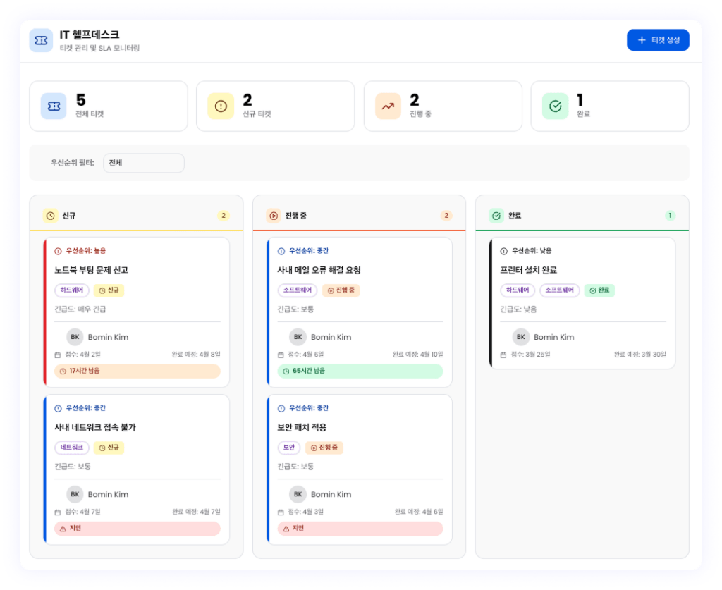 - 프롬프트: IT 티켓 관리 보드 연결 – IT 헬프데스크를 구축해주세요. 해당 시스템은 티켓을 배정하고 진행 상황을 추적하며, 체계적인 대시보드를 통해 중요한 업데이트와 SLA 상태를 한눈에 확인할 수 있어야 합니다. 깔끔한 UI의 포털을 생성해주세요.
