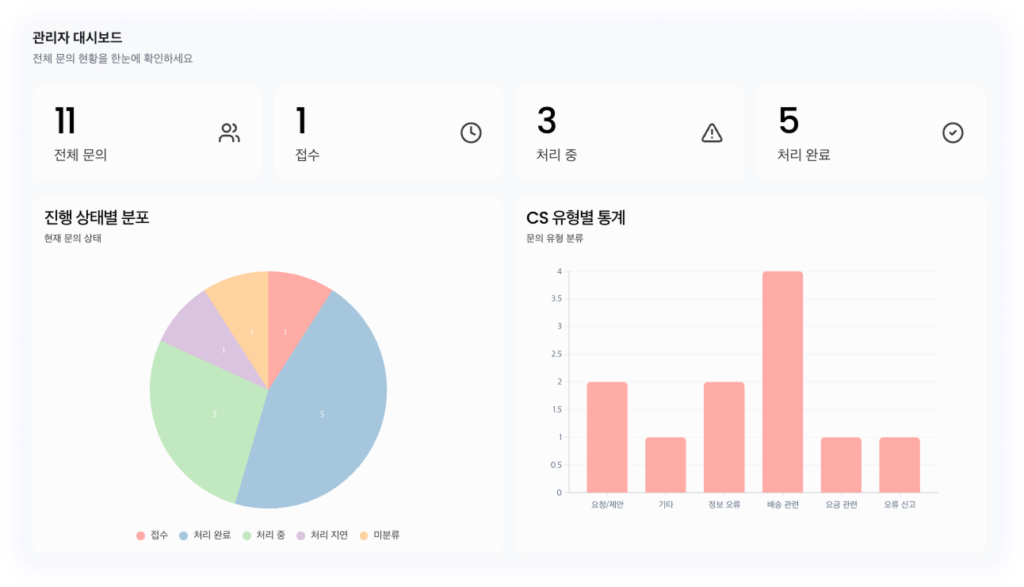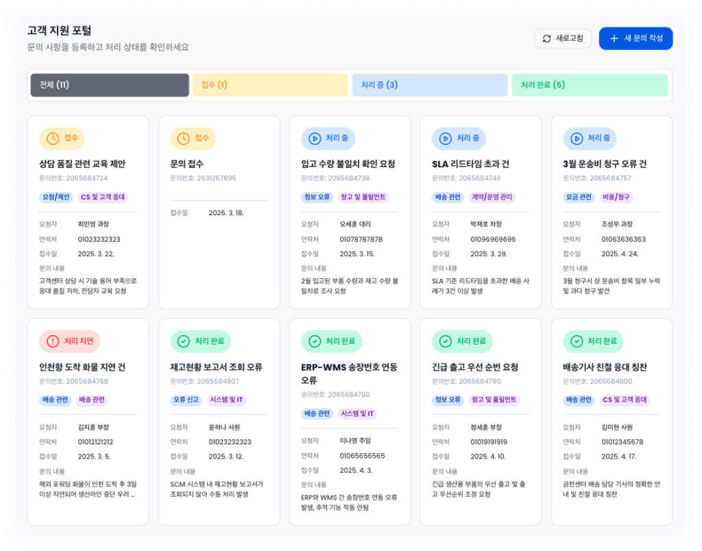 - 프롬프트: VoC 관리 보드 연결 – 고객이 문의 사항을 제출하고, 진행 상황을 확인하며, 서비스 내역을 조회할 수 있는 고객 지원 포털을 구축해주세요. 이 포털은 직관적인 레이아웃과 명확한 상태 표시, 역할 기반 대시보드를 갖추어야 합니다.