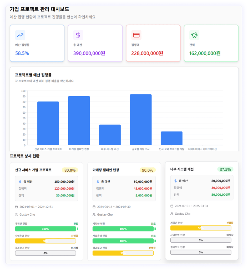 - 프롬프트: 예산 집행률, 총 예산, 예상 잔액, 집행액, 잔액을 보여주고, 과제별 예상 집행률은 차트로 표시해줘. 각 프로젝트별로 계획안, 사업 운영, 결과 보고 현황을 배터리 형태로 시각화해줘. 그리고 디자인은 깔끔한 UI로, 인터랙티브한 차트를 제공해서 사용자가 쉽게 분석할 수 있게 만들어줘.